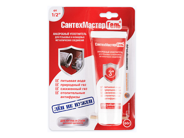 Сантехмастер Гель Красный для чугуна и стали 60 г — это анаэробный герметик для резьбовых соединений из черного металла. Этот гель отлично подходит для сверхпрочной фиксации и герметизации резьбы и фитингов в трубопроводах, собранных с использованием черных металлов. Применяется для соединений диаметром от 1,5.