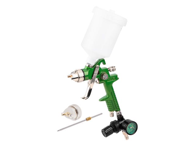 Краскораспылитель HVLP 2-в-1 для нанесения грунта и эмали. В комплекте идет 2 сопла — 1.4 и 1.7 мм. Регулятор с манометром в комплекте позволяет настроить работу краскораспылителя максимально точно.