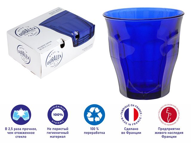 Коллекция Picardie известна своим культовым дизайном от ТМ Duralex , который подойдет к любому столу и событию. Практичные, эстетичные, прочные и эргономичные стаканы. Трендовый цвет «сапфир» создаст настроение и добавит яркости. Стеклянная посуда ТМ Duralex производится во Франции с 1945 года. Процесс закаливания придает стеклу ТМ Duralex особую прочность. Во время закаливания стекло ТМ Duralex , предварительно нагретое до 700°С, подвергается резкому охлаждению холодным воздухом. Этот процесс делает стекло ТМ Duralex в 2,5 раза более устойчивым к механическим повреждениям, чем отожженное стекло. Характеристики: ударопрочное закаленное стекло, термостойкость до 130 ° C (EN 1183), можно мыть в посудомоечной машине, подходит для использования в микроволновой печи.