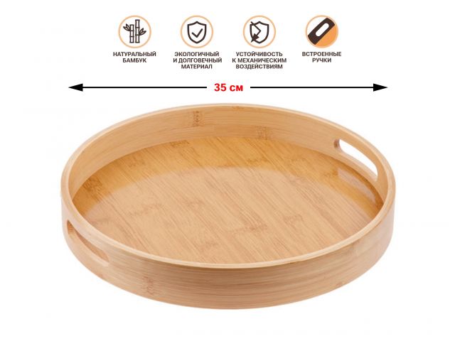 Этот поднос выполнен из бамбука, который является экологически чистым и безопасным для здоровья. Его диаметр 35 см обеспечивает достаточно места для размещения нескольких предметов на поверхности подноса, таких как чашки, блюда, фрукты и т.д. Круглая форма делает его элегантным и стильным дополнением к вашему столу, подчеркивая его утонченность и изысканность.
