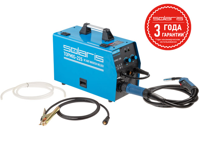 Аппарат оснащен евроразъемом для горелки, возможностью смены полярности для сварки проволокой без газа (FLUX). На выбор представлены 2 комплектации: с горелкой 3 метра (арт.TOPMIG-226WG3) и с горелкой 5 метров (арт.TOPMIG-226WG5).
