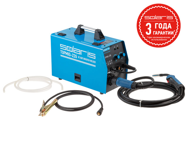 Аппарат оснащен евроразъемом для горелки, возможностью смены полярности для сварки проволокой без газа (FLUX). На выбор представлены 2 комплектации: с горелкой 3 метра (арт.TOPMIG-226WG3) и с горелкой 5 метров (арт.TOPMIG-226WG5).