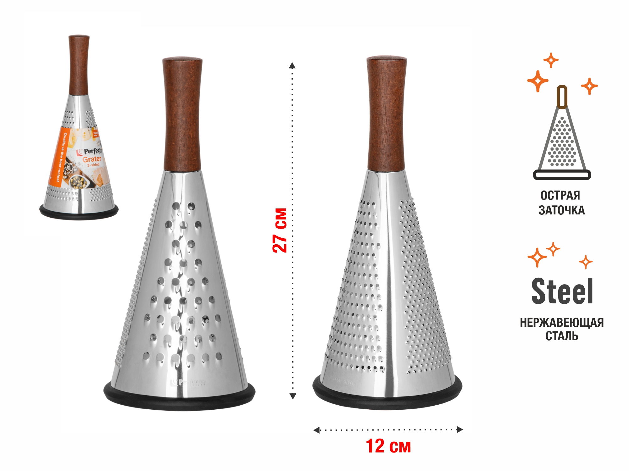 Конусная тёрка для овощей, фруктов и сыра — это настоящее открытие для любителей кулинарии. Этот удобный и практичный инструмент станет незаменимым помощником на кухне. Терка имеет деревянную ручку и круглую форму, что делает ее удобной в использовании. Она легко помещается в руке и не скользит во время работы.