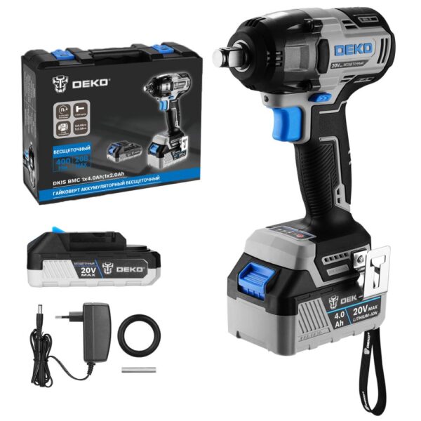 - Гайковерт аккумуляторный бесщеточный DEKO DKIS BMC 1×4.0Ah;1×2.0Ah предназначен для закручивания/ослабления болтов и гаек, сборки деревянных конструкций, сантехнических и общестроительных работ.
