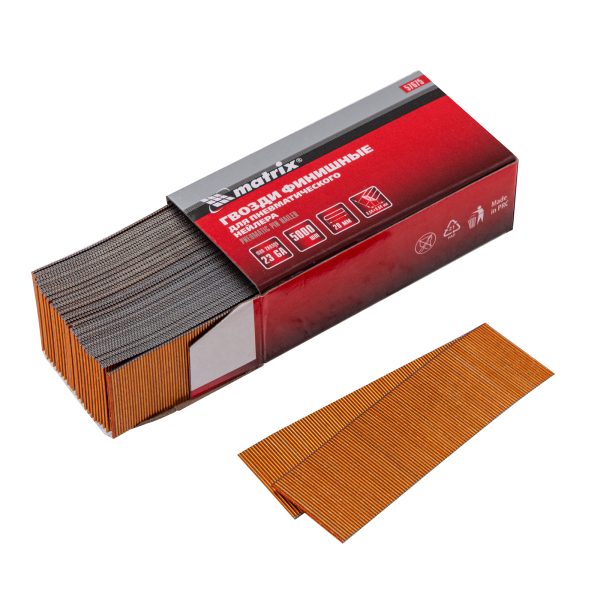 Гвозди финишные (шпильки) Matrix 23GA 57675 диаметром 0,64 мм и длиной 20 мм, 5000 шт., подойдут для работы с пневматическим нейлером любой торговой марки. Используются для быстрого и точного скрепления тонких деревянных материалов и конструирования декоративных элементов.