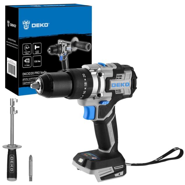 - Дрель-шуруповерт аккумуляторная ударная бесщеточная DEKO DKCID20 PRO body предназначена для сверления отверстий в различных материалах (при установке соответствующих сверл для каждого вида работ), а также для монтажа/демонтажа резьбовых соединений (при установке соответствующих бит и головок).