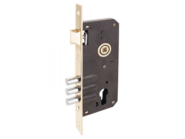 Три цилиндрических стальных ригеля, диаметр 12мм. Вылет ригелей 20мм. Удаление ключевого отверстия 45мм. Межосевое расстояние 85мм. Цвет торцевой планки — латунь, ширина 22мм.