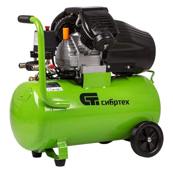 Универсальный передвижной компрессор идеально впишется в бытовые условия, автосервис, гараж, строительную площадку, небольшое производство. Его подключают к пневмоинструментам, например, к гайковерту или продувочному пистолету.,Устройство способно выработать за 1 час 350 л сжатого воздуха. Показатель мощности увеличен до 2.2 кВт, а объем ресивера составляет 50 литров. Двухцилиндровая компоновка, увеличенный магнитопровод статора и автоматизированная намотка двигателя позволили увеличить производительную мощность и достичь высокого рабочего потенциала.,Производитель предусмотрел систему защиты двигателя. Кожух из прочного пластика препятствует попаданию пыли и посторонних частиц в основной узел, сохраняет его от поломок. Системы защиты по току и от перегрева автоматически отключает систему при скачках напряжения и превышении нормальной температуры двигателя.,Еще одно преимущество компрессора — дополнительная обработка картера, которая обеспечивает плотное прилегание прокладок и защиту от протечек масла.