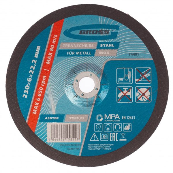 Круг шлифовальный по металлу Gross WA24TBF 74401, 230 х 6,0 х 22,2 мм, применяется для интенсивной сухой обработки нержавеющих, углеродистых сталей и металлических поверхностей. Устанавливается на фланец УШМ с посадочным диаметром 22,2 мм. Круг пригодится для профессионального применения при необходимости зачистки сварных швов, снятия заусенцев, окалины и ржавчины.