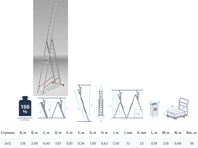 Высота лестницы — 787см, высота стремянки — 299см, высота секции — 316см.
