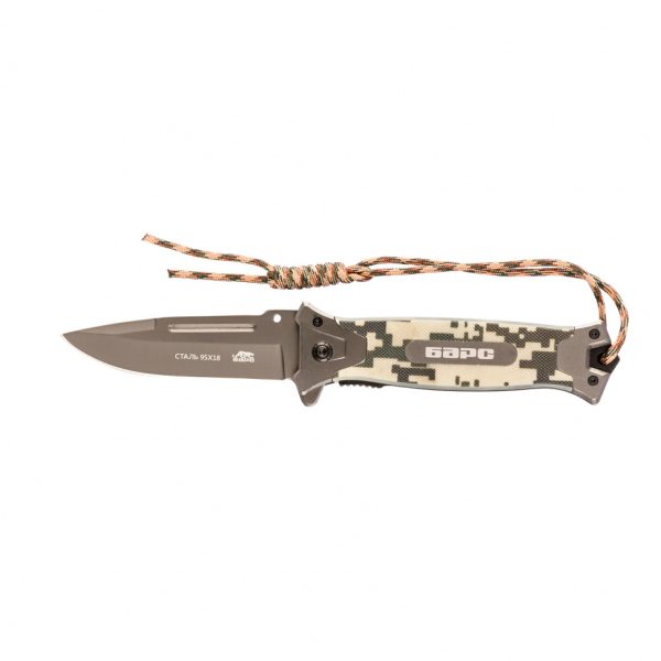 - Обладает высоким ресурсом — лезвие ножа выполнено из стали 95Х18 твердостью 56-58 HRC с антикоррозийным титановым покрытием.