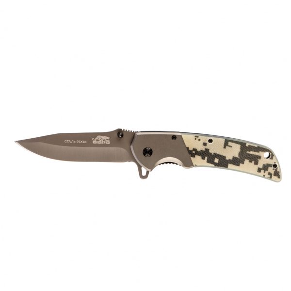 • Высокий ресурс и коррозионная стойкость — лезвие ножа выполнено из стали 95Х18 твердостью 56-58 HRC с титановым покрытием.