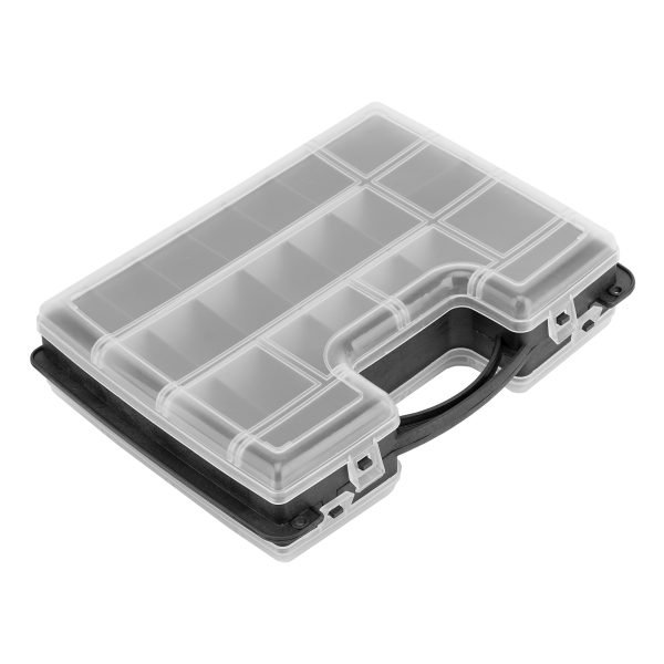 Двухсторонний органайзер Сибртех 90738 размером 295 х 220 х 76 мм помогает рассортировать мелкие вещи и хранить их в порядке и безопасности. В него можно положить снасти, крепеж, элементы рукоделия и т.д. Органайзер не занимает много места, поэтому его можно поместить под кровать, на стеллаж и в другие укромные места.