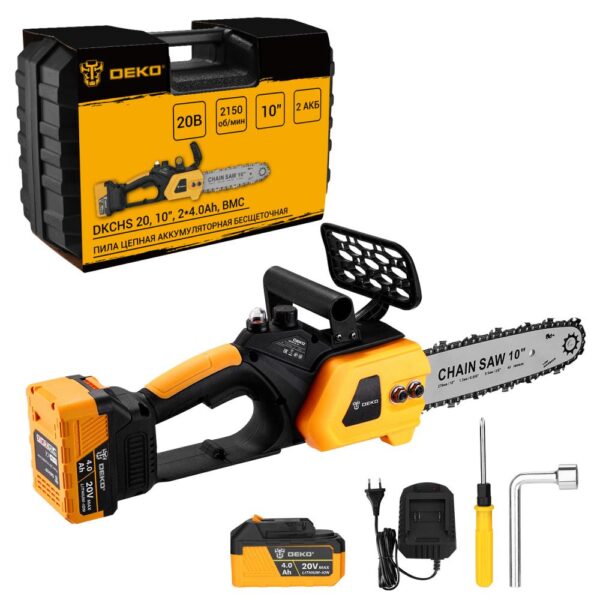 • Пила цепная аккумуляторная бесщеточная в кейсе DEKO DKCHS 20, 10″, 20В, 2×4.0Ач, з/у применяется при работе в мастерской или в саду для распиливания различных материалов.