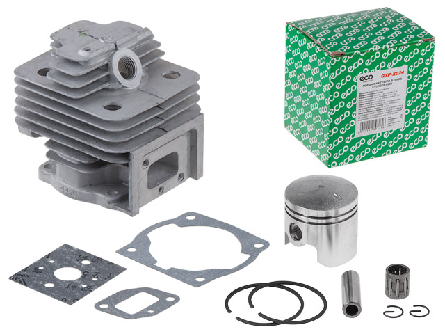 Цилиндр 44мм 1шт, поршень 44мм 1шт, поршневые кольца 2шт, палец 1шт, стопорное кольцо 2шт, игольчатый подшипник 1шт, прокладка цилиндра 1шт, прокладка карбюратора 1шт, прокладка впускного коллектора 1шт,