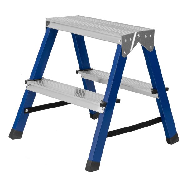 Стремянка двусторонняя стальная Сибртех 97932 с 2 ступенями используется строителями, работниками коммунальных служб, а также полезна в быту. Незаменима, если нужно выполнить монтажные или отделочные работы на высоте, провести уборку, а также достать нужные предметы с антресолей или верхней полки шкафа. На широких ступенях комфортно стоять. Площадка находится на высоте 40,2 см от опорной поверхности, рабочая высота стремянки составляет 240,2 см (при среднем росте пользователя 170 см). Стальная рама прямоугольного сечения выдерживает нагрузку до 150 кг.