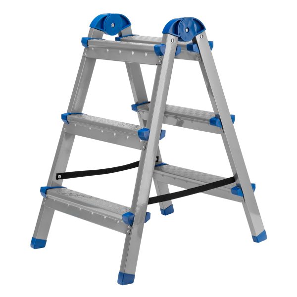 Стремянка двухсторонняя Сибртех 97983 со стальным профилем и 3 стальными ступенями помогает решать бытовые задачи на высоте, превышающей человеческий рост. Ее используют, чтобы доставать предметы с антресолей или шкафов, проводить уборку, менять лампочки, вешать полки или картины. Работать с электроинструментом на ней не рекомендуется. Стремянка с пластиковым складным механизмом повышенной стабильности и широким основанием очень устойчива на ровной поверхности. Площадка находится на высоте 66 см от опорной поверхности, рабочая высота стремянки составляет 266 см (при среднем росте пользователя 170 см).