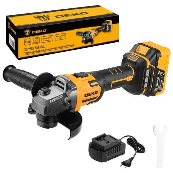 - Углошлифовальная машина бесщеточная DEKO ZKAG20 1×4.0Ah предназначена для резки, шлифовки, черновой обработки и полировки металлов, камней и керамических изделий с соответствующими насадками.