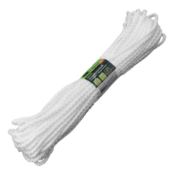 Вязаный полипропиленовый шнур с сердечником Сибртех 93958 белого цвета, диаметром 5 мм, длиной 20 м, будет полезен для хозяйственных нужд: сушки белья, связывания предметов, подвязки растений. Пригодится также в походе, на охоте или рыбалке. Благодаря сердечнику и высокопрочной оплетке обладает повышенной устойчивостью к истиранию и разрыву — максимальная разрывная нагрузка составляет 90 кгс. Шнур выдерживает значительный вес, не растягивается и не провисает.
