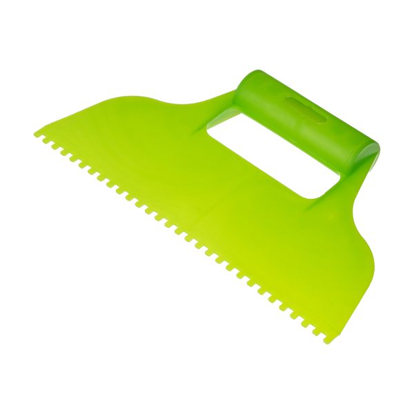 Пластмассовый шпатель для клея Сибртех 86014, зубчатый (квадратные зубья 4 х 4 мм), рассчитан на нанесение клеевых составов и их последующее выравнивание. Зубчатая рабочая часть позволяет равномерно наносить смесь для надежного соединения с плиткой и расходовать ее экономно.