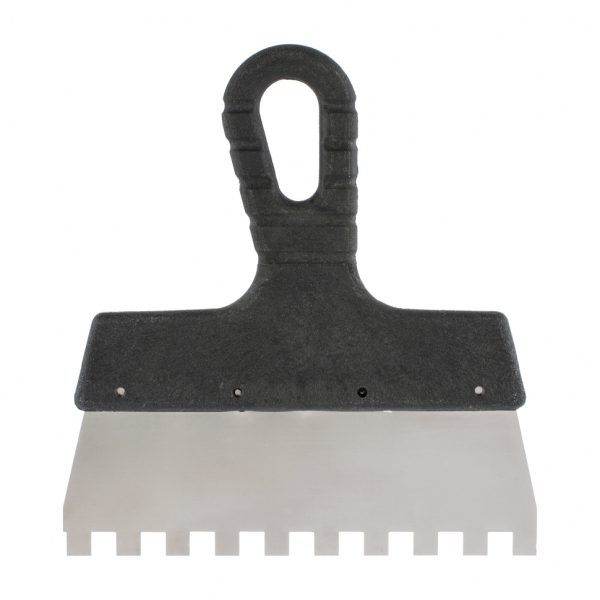 Шпатель Sparta 85147 из нержавеющей стали, шириной 150 мм, с пластмассовой рукояткой и зубьями 10 х 10 мм, применяется во время проведения работ по укладке плитки, мозаики и т. д. Квадратные зубья облегчают нанесение клеевого состава, позволяя равномерно распределять его по поверхности. Зубья размером 10 х 10 мм рассчитаны на плитку площадью 900-2500 см2.