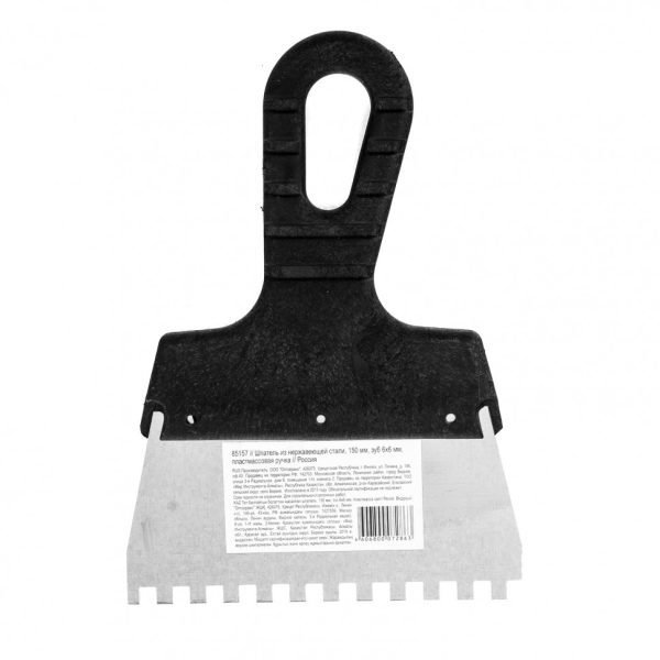 Шпатель Sparta 85157 из нержавеющей стали, шириной 150 мм, с пластмассовой рукояткой и зубьями 6 х 6 мм, применяется во время проведения работ по укладке плитки, мозаики и т. д. Квадратные зубья облегчают нанесение клеевого состава, позволяя равномерно распределять его по поверхности. Зубья размером 6 х 6 мм рассчитаны на плитку площадью 100-400 см2.