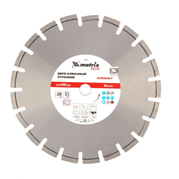 Алмазный диск Matrix PRO «Асфальт» 731073 диаметром 350 х 25,4 мм используется для сухого и мокрого реза асфальта, свежего бетона, асфальтобетона, камня, кирпича, абразивных материалов. Устанавливается на ручной бензорез или швонарезчик с посадочным диаметром 25,4 мм. Диск устойчив к деформациям и выдерживает значительные нагрузки. Для увеличения ресурса диска рекомендуется проводить мокрое резание.