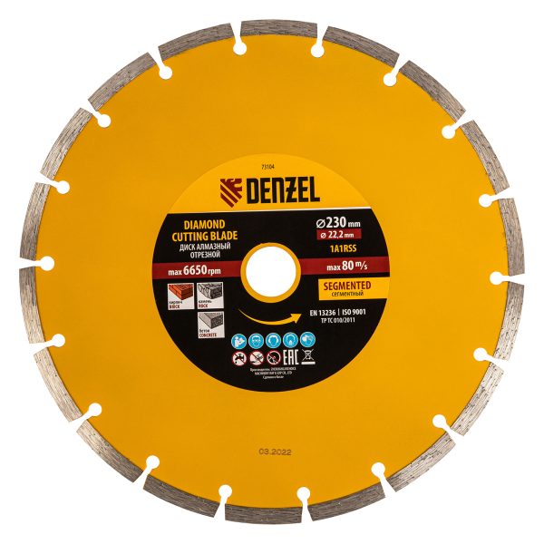 Отрезной сегментный алмазный диск Denzel 73104 диаметром 230 х 22,2 мм — оснастка для УШМ, использующаяся для сухой резки свежего и старого бетона, камня, кирпича, шлакоблока, мрамора, тротуарной плитки, гранита. Диск сегментного типа отличается высокой производительностью даже при интенсивных нагрузках. Подходит для бытового и профессионального использования.