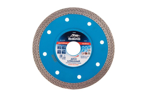 Тонкий сплошной алмазный диск Барс ф125х22,2 мм 73092 с особой формой рабочей части применяется как для сухого, так и мокрого резания гранита и керамогранита, плитки, кафеля, мрамора, искусственного и натурального камня с помощью УШМ или плиткореза. Уменьшенная толщина диска позволяет снизить нагрузку на рабочий инструмент при резке керамогранита и других твердых материалов. Диск предназначен для профессиональной эксплуатации. Использование водяного охлаждения увеличивает ресурс диска и снижает вероятность получения сколов.