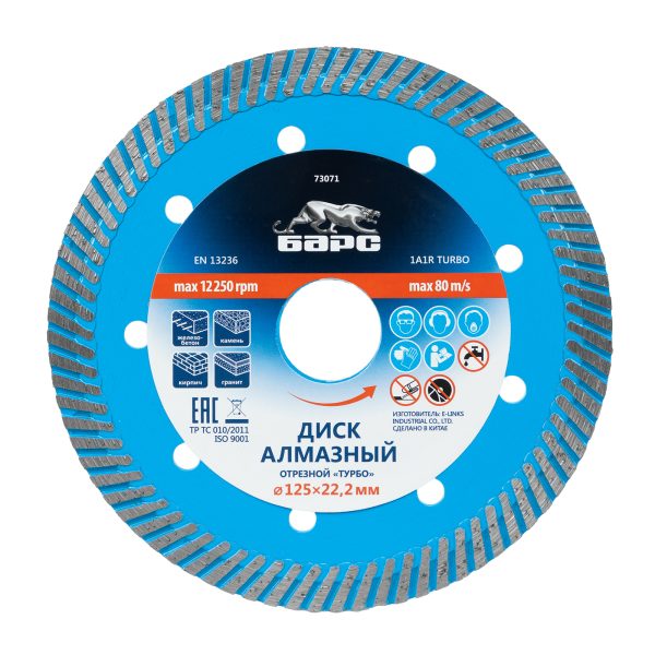 Алмазный диск Барс Турбо 73071 диаметром 125 х 22,2 мм предназначен для сухого резания бетона, в т.ч. свежего, среднеармированного железобетона, камня, кирпича, гранита и песчаника. Совместим с УШМ с посадочным диаметром 22,2 мм, используется для проведения строительных и ремонтных работ.