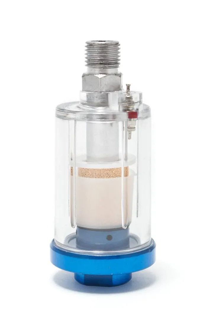Фильтр имеет стандартный размер резьбы 1/4", что позволяет легко подключать его к воздушной линии краскопульта.