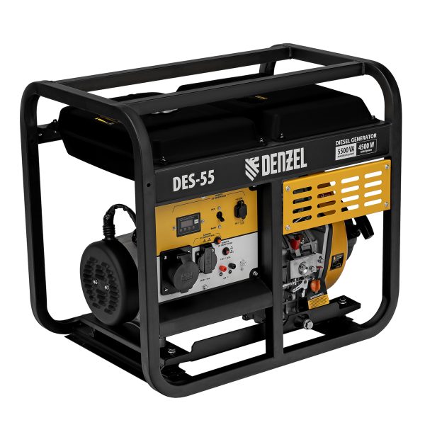 Генератор дизельный Denzel DES-55 94413 с объемом топливного бака 11 л, с ручным стартером, имеет максимальную выходную мощность 5,5 кВт и поддерживает напряжение в сети 230 В. Используется для снабжения энергией потребителей однофазного тока (осветительных приборов, бытовой техники, электроинструмента) при отсутствии доступа к стационарному источнику питания. Для подключения электроприборов служат 2 розетки: 230 В/16 А и 230 В/32 А. Клеммы постоянного тока 12 В позволяют заряжать автомобильные аккумуляторы, а двойной выход USB 5 В предназначен для подключения мобильных устройств (планшетов, смартфонов и т. д.). Генератор пригодится на строительной площадке и в загородном доме.