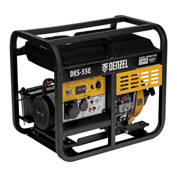 Генератор дизельный Denzel DES-55E 94414 с объемом топливного бака 11 л, с электростартером, имеет максимальную выходную мощность 5,5 кВт и поддерживает напряжение в сети 230 В. Используется для снабжения энергией потребителей однофазного тока (осветительных приборов, бытовой техники, электроинструмента) при отсутствии доступа к стационарному источнику питания. Для подключения электроприборов служат 2 розетки: 230 В/16 А и 230 В/32 А. Клеммы постоянного тока 12 В позволяют заряжать автомобильные аккумуляторы, а двойной выход USB 5 В предназначен для подключения мобильных устройств (планшетов, смартфонов и т. д.). Генератор пригодится в загородном доме.