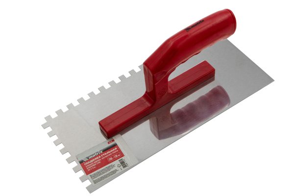 - Долговечность — гладилка из нержавеющей стали не боится коррозии, обладает оптимальным соотношением упругости и прочности.