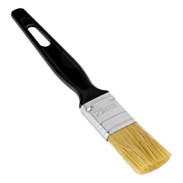 - Ширина 25 мм — кисть оптимальна для окрашивания углов, мелких деталей, плинтусов и рам.