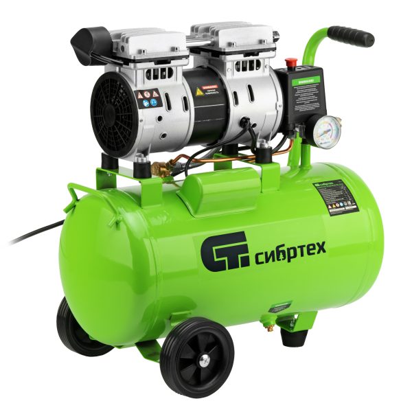 Безмасляный малошумный компрессор Сибртех МБ 1100/24 58006 мощностью 1100 Вт и объемом ресивера 24 л имеет производительность на входе 170 л/мин и сжимает воздух под давлением до 8 бар. Используется для обеспечения функционирования пневмоинструмента, например, краскораспылителя или пневматического шуруповерта. Для работы устройства не требуется масло, поэтому воздух на выходе не содержит его частиц. Компрессор оптимален для проведения покрасочных работ и продувки электронных компонентов.,Одна из ключевых особенностей компрессора — низкий уровень шума (не превышает 70 дБ), позволяющий использовать устройство в жилом помещении без дискомфорта для людей.