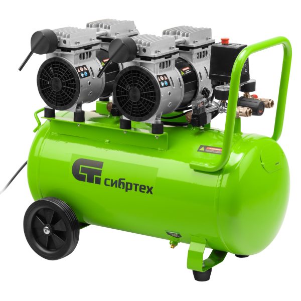 Безмасляный малошумный компрессор Сибртех МБ 2000/50 58007 мощностью 2000 Вт и объемом ресивера 50 л имеет производительность на входе 300 л/мин и сжимает воздух под давлением до 8 бар. Используется для обеспечения функционирования пневмоинструмента, например, краскораспылителя, перфоратора или пневматического шуруповерта. Для работы устройства не требуется масло, поэтому воздух на выходе не содержит его частиц. Компрессор оптимален для проведения покрасочных работ и продувки электронных компонентов.,Одна из ключевых особенностей компрессора — низкий уровень шума (не превышает 70 дБ), позволяющий использовать устройство в жилом помещении без дискомфорта для людей.