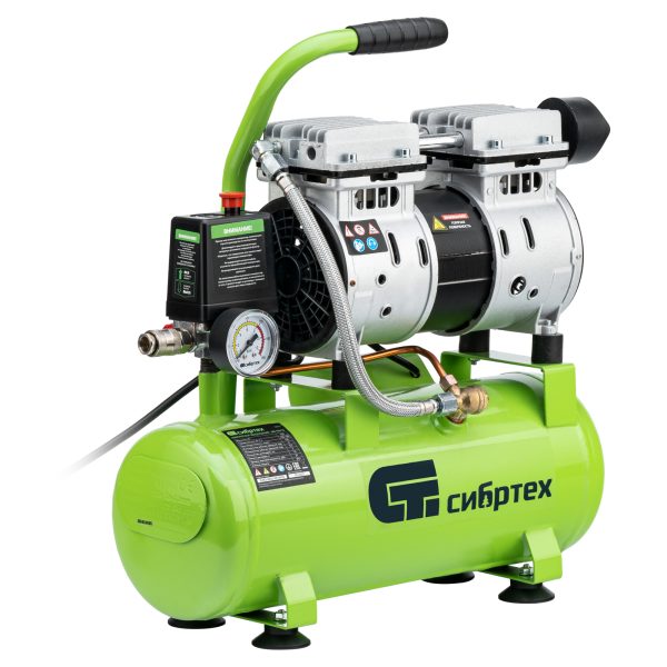 Безмасляный малошумный компрессор Сибртех МБ 750/10 58001 мощностью 750 Вт и объемом ресивера 10 л имеет производительность на входе 150 л/мин и сжимает воздух под давлением до 8 бар. Используется для обеспечения функционирования пневмоинструмента, например, краскораспылителя или пневматического шуруповерта. Для работы устройства не требуется масло, поэтому воздух на выходе не содержит его частиц. Компрессор оптимален для проведения покрасочных работ и продувки электронных компонентов.,Одна из ключевых особенностей компрессора — низкий уровень шума (в районе 65 дБ), позволяющий использовать устройство в жилом помещении без дискомфорта для людей.