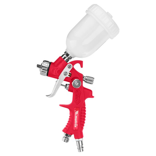 Пневматический краскораспылитель HVLP Matrix 57325 с верхним бачком объемом 0,1 л и соплом диаметром 0,8 мм расходует 50-140 литров в минуту и используется для равномерного нанесения лакокрасочных материалов, пропиток, грунтовок и других растворов. Подходит для обработки небольших участков. Распыление по технологии HVLP (High Volume Low Pressure, высокий объем, низкое давление) обеспечивает качественное нанесение покрытия. Краскораспылитель пригодится во время отделочных, ремонтных работ, а также обслуживания автомобилей.