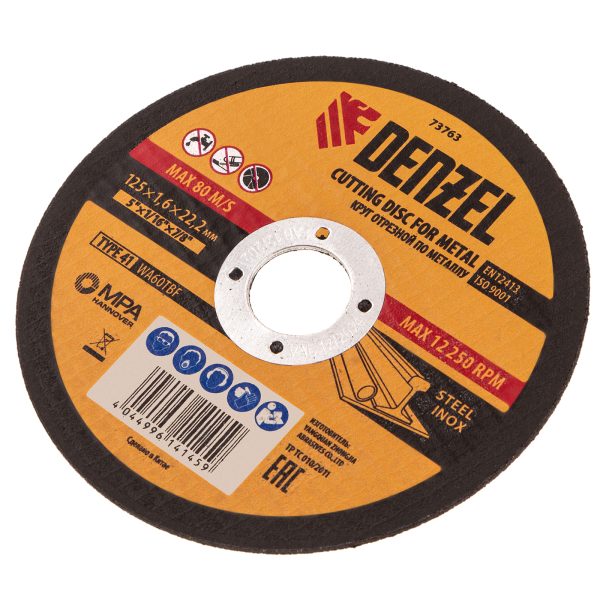 Отрезной круг по металлу Denzel WA60TBF 73763 размером 125 х 1,6 х 22,2 мм рассчитан на интенсивную работу с УШМ. Подходит для резки углеродистой и нержавеющей легированной стали. Круг можно использовать не только в быту, но и для решения профессиональных задач.