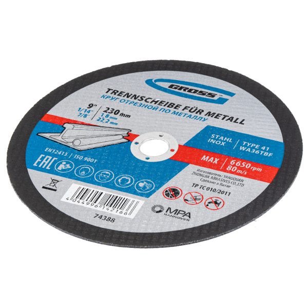 Отрезной круг по металлу Gross WA36TBF 74388 размером 230 х 1,8 х 22,2 мм рассчитан на интенсивный сухой рез углеродистых и нержавеющих легированных сталей, алюминия, чугуна. Устанавливается на УШМ соответствующего типоразмера и не требует частой замены, подходит для профессиональной эксплуатации с высокими нагрузками.
