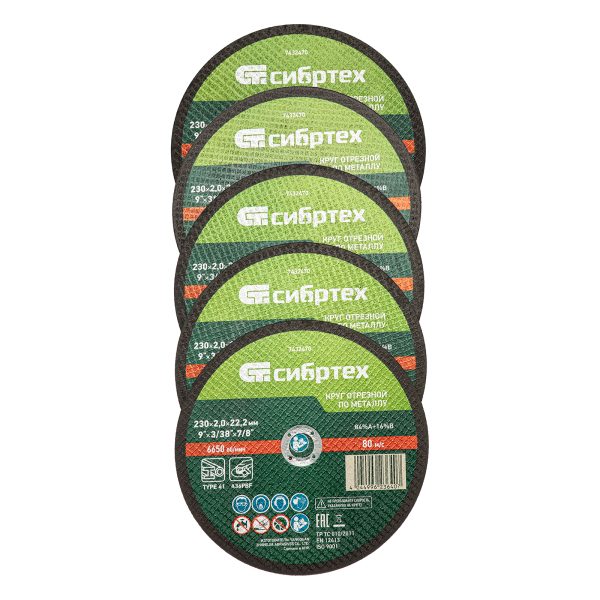 Круг отрезной по металлу Сибртех 84%A+16%B 7432470 диаметром 230 мм и толщиной 2,0 мм, 5 шт. в металлической банке, устанавливается на УШМ с посадочным размером 22,2 мм. Предназначен для сухой резки углеродистых сталей. Набор пригодится частному мастеру для проведения ремонтных работ дома или в гараже, также подойдет для профессионального применения.