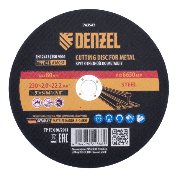 Круг отрезной по металлу Denzel 743543 (A36QBF) размером 230 х 2,0 х 22,2 мм оптимально подходит для реза углеродистых сталей. Используется на УШМ с посадочным диаметром 22,2 мм. Круг рассчитан на профессиональное и бытовое использование, сухой рез.