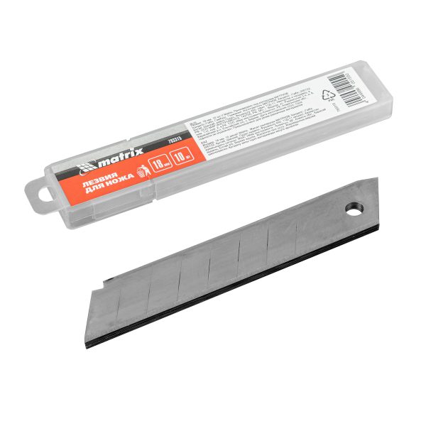 Лезвия Matrix 793315 шириной 18 мм и длиной 109 мм, 10 шт. в упаковке, — запасные части к монтажным ножам соответствующего типоразмера. Ими можно резать твердые материалы, линолеум, пластик, гипсокартон, а также бумагу, пленку, картон. Лезвия используются при проведении строительных и отделочных работ, а также применяются в хозяйственных целях.