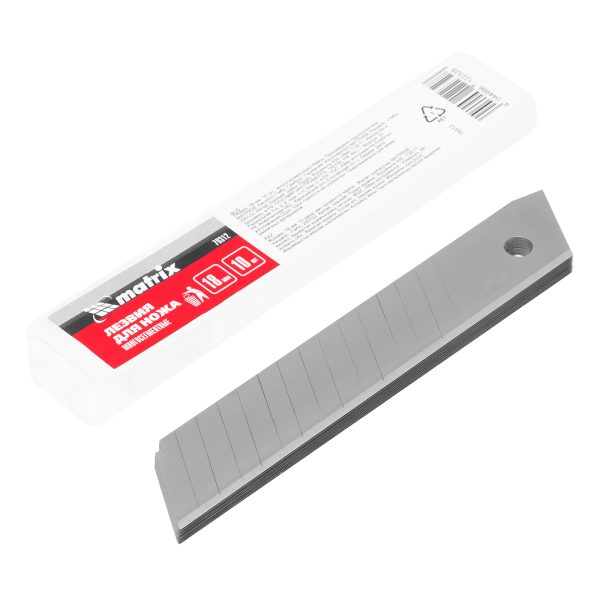 Многосегментные лезвия Matrix 79312 шириной 18 мм и длиной 109 мм, 10 шт. в упаковке, — запасные части к монтажным ножам соответствующего типоразмера. Ими можно резать твердые материалы, линолеум, пластик, гипсокартон, а также бумагу, пленку, картон. Лезвия используются при проведении строительных и отделочных работ, а также применяются в хозяйственных целях.