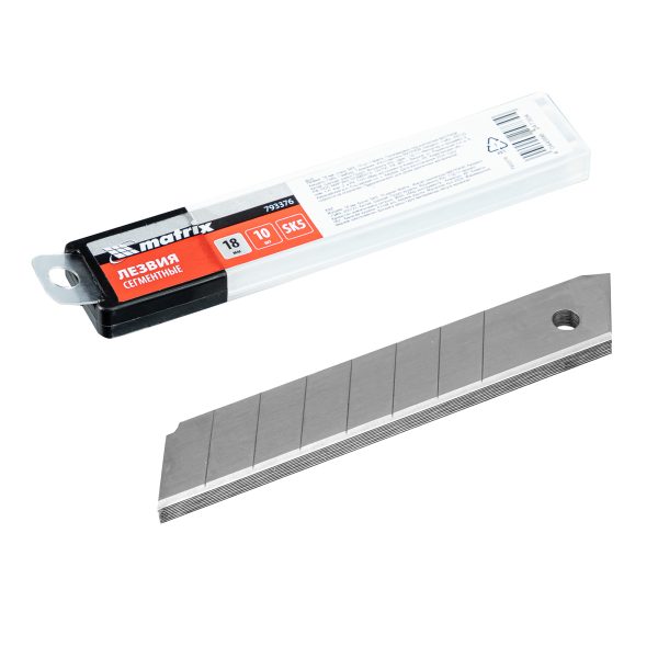Лезвия Matrix 793376 из стали SK5, шириной 18 мм и длиной 100 мм, 10 шт. в упаковке, — сменные режущие элементы для монтажных ножей соответствующего типоразмера. Режут бумагу, пленку, картон, а также плотные материалы: линолеум, пластик, гипсокартон. Используются во время проведения строительных и отделочных работ, также полезны в быту.