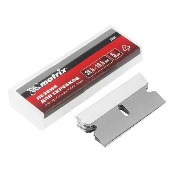 Лезвия Matrix 79551 размером 39,5 х 19,5мм, 5 шт., являются запасными режущими элементами для большого количества скребков: арт. 79547, 79539, 79505, 79544. Благодаря им можно аккуратно очистить стекло, кафель и иные гладкие поверхности.