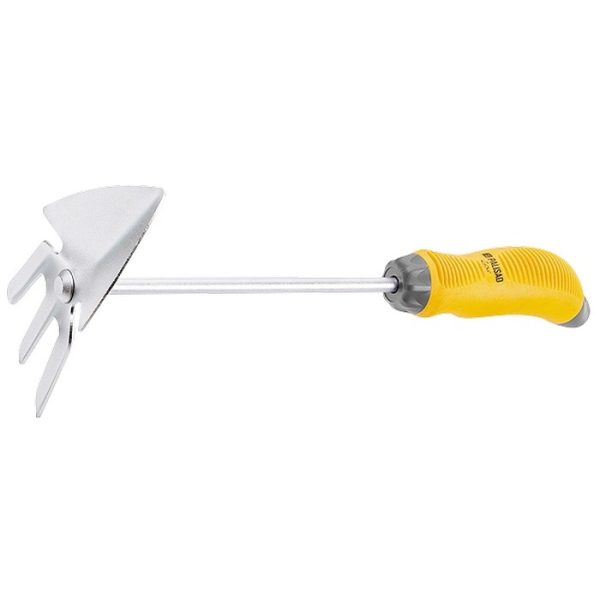 Мотыжка комбинированная с эргономичной двухкомпонентной рукояткой.Ширина рабочей части 70 мм, длина 175 мм, общая длина 325 мм.Предназначена для рыхления, аэрации почвы и прополки на небольших грядках и клумбах.