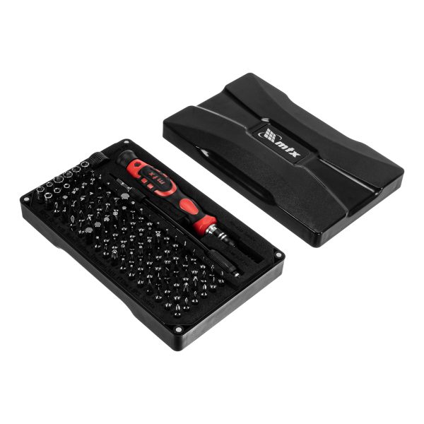 Набор для точных работ MTX 135697 включает в себя 93 биты, 9 торцевых головок, телескопический и гибкий удлинители, намагничиватель-размагничиватель бит, отвертку и пинцет с защитным колпачком. С его помощью можно отремонтировать очки, игрушки, портативную и бытовую технику и т.д. Выдвижной стержень, гибкий удлинитель и пинцет позволяют работать с мелкими деталями в углублениях и труднодоступных местах.
