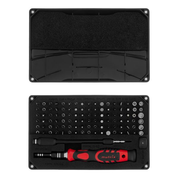 Биты для точных работ: H (0.7, 0.9, 1,3, 1.5, 2, 2.5, 3, 4, 4.5, 5, 6), T (1, 2, 3, 4, 5, 6, 7, 8, 9, 10, 15, 20), TT (6, 7, 8, 9, 10, 15, 20), PH (1, 1.5, 2, 2.5, 4), PZ (1, 2, 3, 4), SL (1, 1.3, 1.5, 2, 2.5, 3, 3.5, 4), Str (0.8, 1.2, 1.5, 2), Y (0.8, 2, 2.5, 3), STANDOFF (1.5), TA (2, 2.3, 2.6, 3), U (2.6, 3), SQ (0, 1, 2), SIM (0.8, 1) — 93 штТорцевые головки: H (2.5, 3, 3.5, 4, 4.5, 5, 5.5), TT (3.8, 4.5) — 9 штТелескопический удлинитель — 1 штГибкий удлинитель — 1 штНамагничиватель-размагничиватель — 1 штОтвертка — 1 штПинцет с защитным колпачком — 1 штПластиковый кейс — 1 шт
